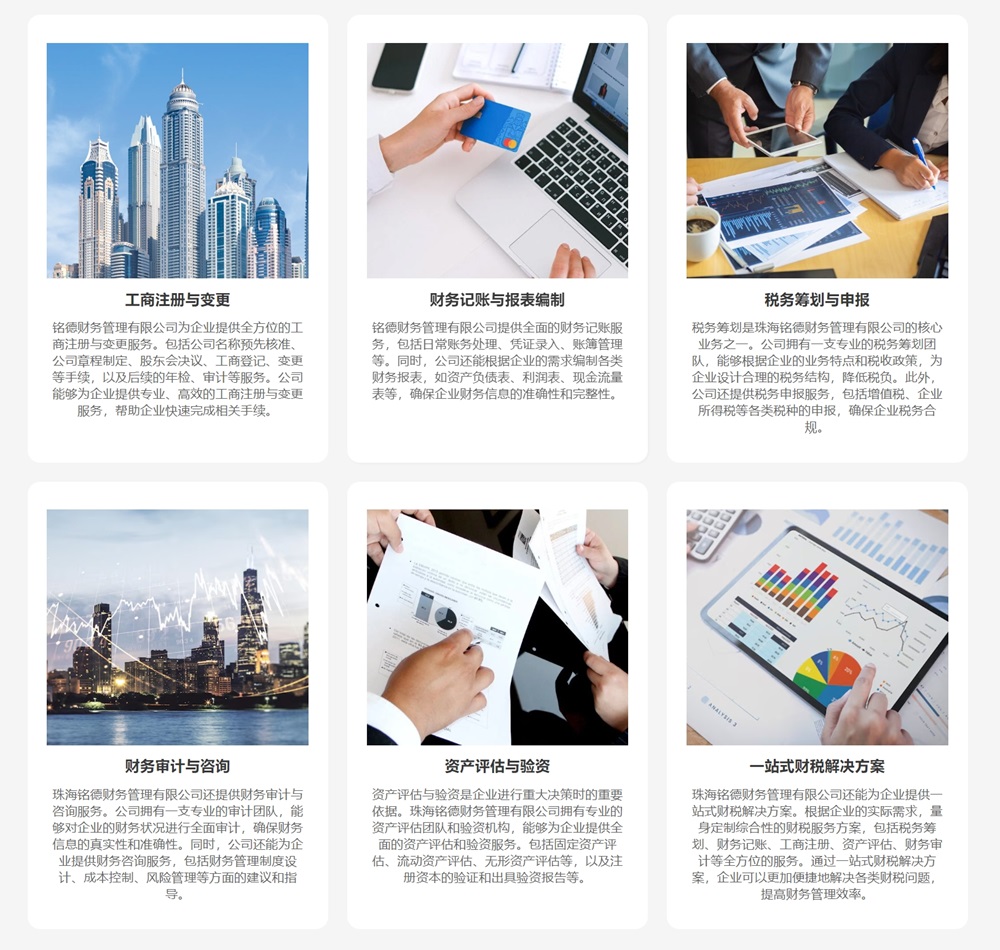 1.代理(lǐ)記帳:代理(lǐ)記帳、¶ ¶建帳、報(bào)稅、常年(nián)帳務清理(lǐ♥$)、稅務籌劃、一(yī)般納稅人(rén)咨詢;