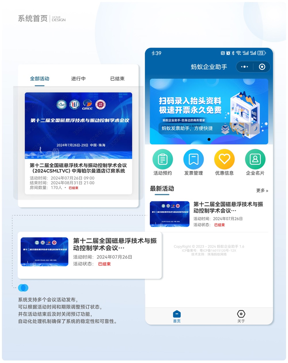 螞蟻網絡本次與珠海(hǎi)格力電(dià&<©£n)器(qì)股份有(yǒu)限公司合作(≥±→☆zuò)的(de)小(xiǎo)程序項目,是(shì)針對(duì)學術(π€shù)會(huì)議(yì)交流活動開(kāi)發的(d↓™e)一(yī)款小(xiǎo)程序酒店(diàn)預約訂房(fáng)系統,φ®→♣以下(xià)是(shì)一(yī)個(gè)更加詳細且針對(duì)性的(dα e)系統設計(jì)方案: